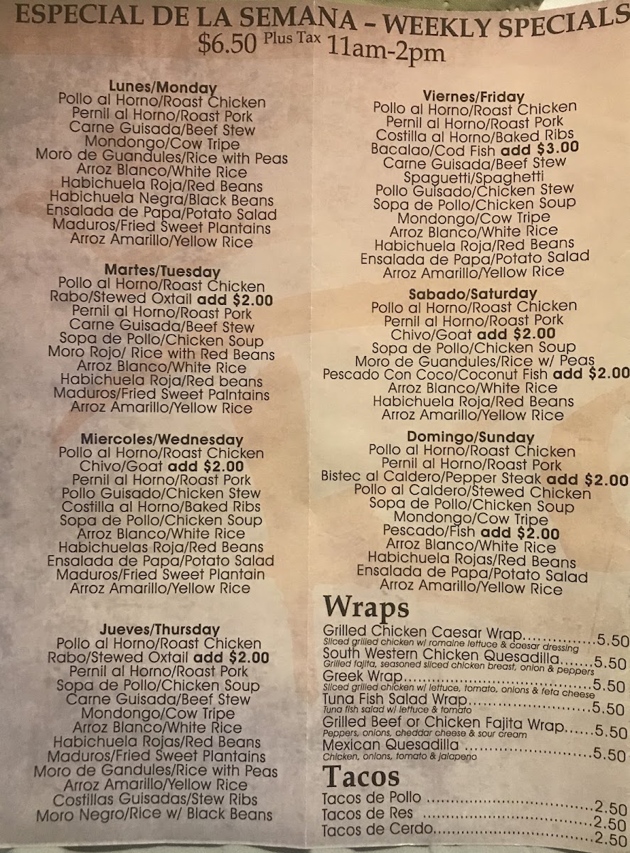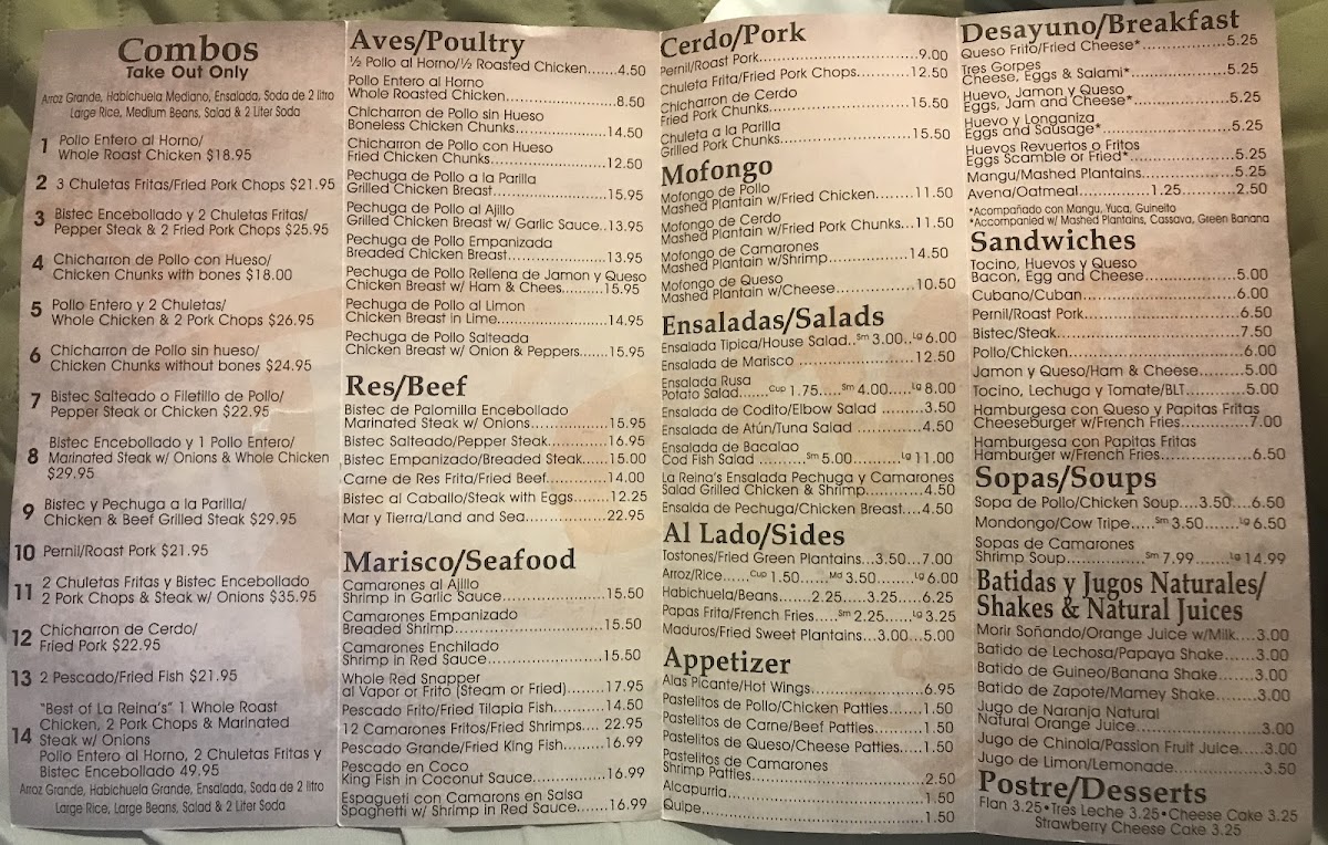 La Reina Restaurant offers a diverse and satisfying menu, perfect for those craving rich Latin flavors. The Daily Lunch Specials (Especial de la Semana) include comforting dishes such as the Beef Stew Lunch Special ($12.99), Roast Pork Lunch Special ($13.99), and Stewed Oxtail Lunch Special ($14.99), each offering a hearty, flavorful meal. For seafood enthusiasts, the Spaghetti with Shrimp in Red Sauce ($15.99), Whole Red Snapper ($17.99), and Shrimp in Garlic Sauce ($14.99) deliver fresh and delicious options. If you're in the mood for something lighter, the Chicken Soup ($7.99) or Shrimp Soup ($9.99) are great choices.